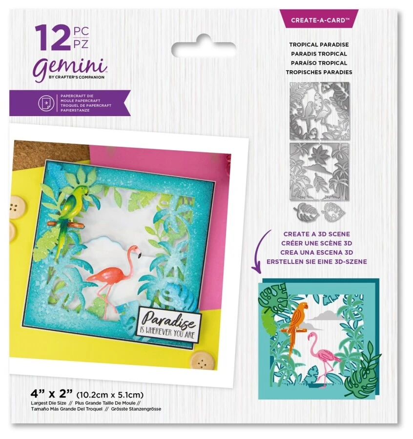 Das Tropenparadies-Set enthält 12 Stanzformen, um einen üppigen und grünen Rahmen aus tropischen Blättern und Palmen zu schaffen, der eine Szene aus eleganten Flamingos und farbenfrohen Papageien enthüllt.