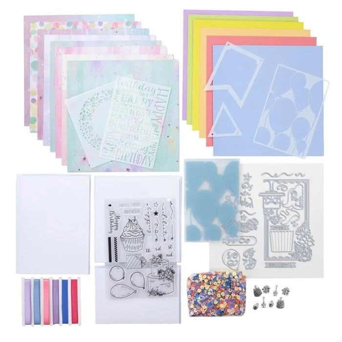 Es ist vollgepackt mit Stempeln, Stanzformen, Designpapier, Anhängern, Pailletten, Bändern und vielem mehr. Von Luftballons und Luftschlangen bis hin zu Kuchen, Kerzen und fröhlichen Botschaften können Sie Karten in einer Vielzahl von Stilen erstellen, um etwas Perfektes für den Empfänger zu schaffen. Und alles wird exklusiv für Sie entworfen und ausgewählt!